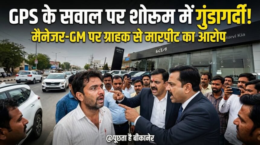 बीकानेर में अब गाड़ियों के साथ-साथ डंडों की डील भी मिलने लगी है। मामला KIA शोरूम का है, जहाँ GPS न लगने पर ग्राहक ने जब अपना पैसा वापस माँगा, तो जवाब में सेल्स पिच नहीं, सीधा मुक्का मिला। पहली तस्वीर में माइक के सामने सफाई दी जा रही है, दूसरी में शोरूम के बाहर सड़क पर खड़ी गाड़ियाँ सिस्टम को खुली चुनौती देती दिख रही हैं, और तीसरी तस्वीर उस सच की गवाही है जहाँ ग्राहक की नाक से बहता खून सवाल पूछ रहा है — “क्या सवाल पूछना अब अपराध है?” आरोप है कि शोरूम के GM और मैनेजर ने मिलकर ग्राहक की बेरहमी से पिटाई की, लेकिन प्रशासन अब भी GPS सिग्नल की तरह ही गायब है। आम आदमी गाड़ी खड़ी करे तो चालान, बड़े शोरूम सड़क घेर लें तो साइलेंस मोड।