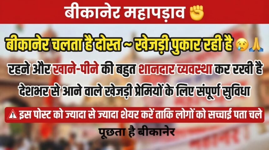 बीकानेर में आयोजित खेजड़ी महापड़ाव अब केवल एक आंदोलन नहीं, बल्कि जनभावनाओं और जनसंकल्प का प्रतीक बन चुका है। इस ऐतिहासिक महापड़ाव में देशभर से बीकानेर पहुँचने वाले हजारों लोगों के लिए रहने और खाने-पीने की संपूर्ण एवं व्यवस्थित व्यवस्था की गई है, ताकि किसी भी सहभागी को किसी प्रकार की असुविधा न हो। जाट धर्मशाला (पूर्व आरक्षित), बिश्नोई धर्मशाला सहित अन्य धर्मशालाओं में ठहरने की सुविधा उपलब्ध कराई गई है, वहीं मुकाम से भंडारा सहयोग दल बीकानेर पहुँच चुका है, जिससे भोजन और जल व्यवस्था लगातार सुचारु रूप से संचालित की जा रही है। 1 फरवरी से ही हजारों लोग गाँवों और ढाणियों से निकलकर बीकानेर पहुँचना शुरू हो चुके हैं, क्योंकि यह आंदोलन केवल खेजड़ी की रक्षा का नहीं, बल्कि आने वाली पीढ़ियों के भविष्य और पर्यावरण संरक्षण की लड़ाई है। महापड़ाव शांतिपूर्ण, संगठित और जनसमर्थन आधारित है, जहाँ हर व्यक्ति का स्वागत और सम्मान सुनिश्चित किया गया है। संदेश स्पष्ट है—अब लोग चुप नहीं बैठेंगे, घरों से निकलकर एकजुट होंगे और सरकार तक अपनी आवाज़ मजबूती से पहुँचाएँगे।