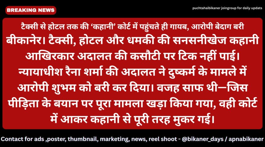 बीकानेर। टैक्सी, होटल और धमकी की सनसनीखेज कहानी आखिरकार अदालत की कसौटी पर टिक नहीं पाई। न्यायाधीश रैना शर्मा की अदालत ने दुष्कर्म के मामले में आरोपी शुभम को बरी कर दिया। वजह साफ थी—जिस पीड़िता के बयान पर पूरा मामला खड़ा किया गया, वही कोर्ट में आकर कहानी से पूरी तरह मुकर गई।अभियोजन के अनुसार, पीड़िता ने पुलिस को दी रिपोर्ट में आरोप लगाया था कि आरोपी शुभम, जो रिश्ते में उसका मामा लगता है, फोटो वायरल करने की धमकी देकर उसे मिलने बुलाता था। आरोप था कि 17 जून 2025 को उसे टैक्सी में बैठाकर होटल ले जाया गया, जहां जबरन दुष्कर्म किया गया और बाद में वीडियो वायरल करने की धमकी दी गई। मामला कागजों में तो बेहद गंभीर था, लेकिन अदालत में आते-आते ‘फाइलों की कहानी’ रह गया।