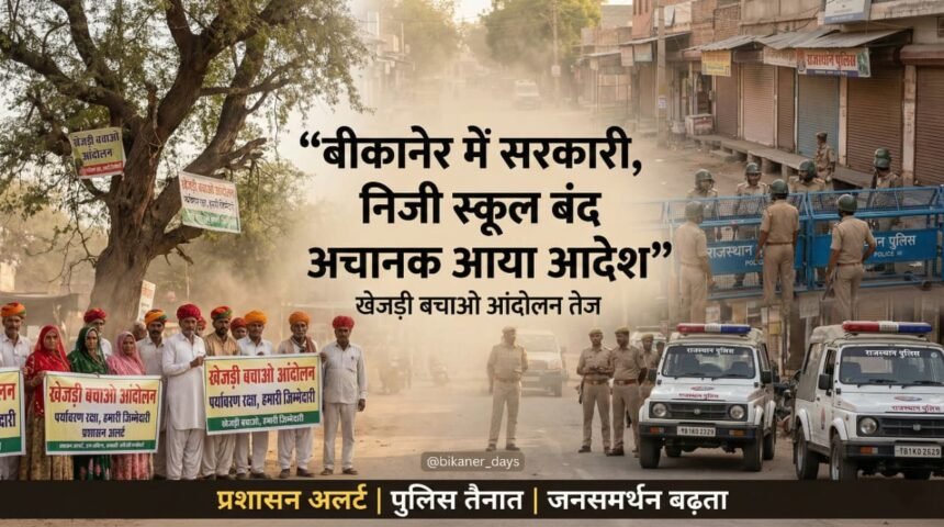 बीकानेर। खेजड़ी बचाओ आंदोलन के आह्वान पर आज बीकानेर बंद है—और इस बार बंद सिर्फ सड़कों पर नहीं, सिस्टम पर भी असर डालता दिख रहा है। पर्यावरण प्रेमियों की अपील के बाद प्रशासन अचानक अलर्ट मोड में आ गया है, वहीं व्यापारिक संगठनों ने बंद को खुला समर्थन दे दिया है। हालात ऐसे बने कि शहरी क्षेत्र के सरकारी और निजी स्कूलों में लंच टाइम के बाद छुट्टी घोषित करनी पड़ी, जबकि ग्रामीण इलाकों में स्कूल यथावत खुले रखे गए हैं। कानून-व्यवस्था बनाए रखने के लिए पुलिस की तैनाती बढ़ा दी गई है और शहर के प्रमुख इलाकों पर नजर रखी जा रही है। जिला शिक्षा अधिकारी (मुख्यालय) द्वारा यह आदेश रविवार रात करीब साढ़े दस बजे जारी किया गया, जिसने यह साफ कर दिया कि दबाव हो तो फैसले रातों-रात भी बदल सकते हैं। संदेश सीधा है—सरकार शायद खुद न झुके, लेकिन जनता जब खड़ी हो जाती है तो झुकना पड़ता है।